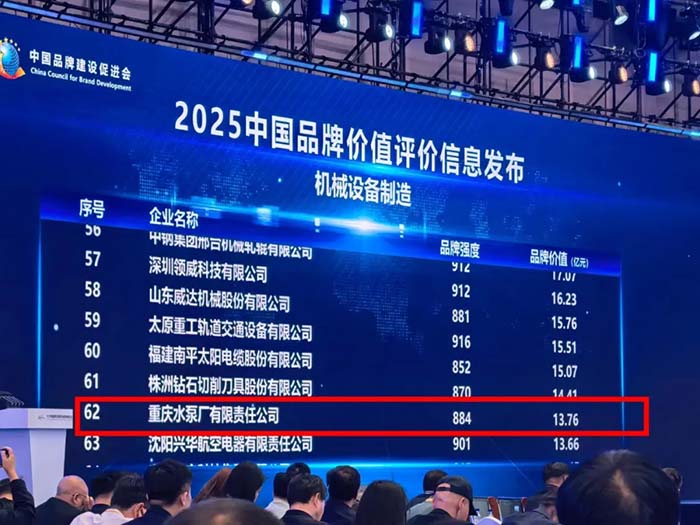 5月10日,由新华通讯社、中国品牌建设促进会、中国资产评估协会指导,新华社品牌工作办公室、新华社浙江分社、《中国品牌》杂志社、中国国家品牌网承办的“2025中国品牌价值评价信息发布暨论坛”在浙江德清举行。重泵公司受邀参加活动,并以品牌强度884、品牌价值13.76亿元品牌价值较2024年增长了11%,位列竞争激烈的“机械设备制造”组第62位,荣登2025中国品牌价值评价信息发布榜。