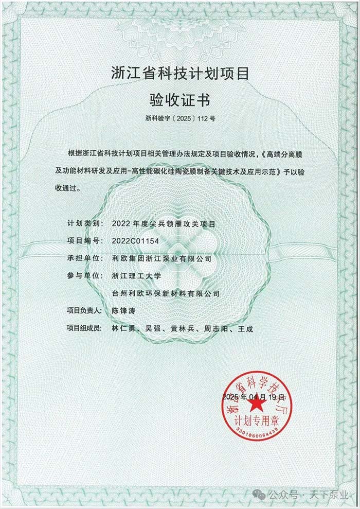 近月,利欧泵业牵头负责的浙江省“尖兵”“领雁”研发攻关计划项目取得重大成果。由利欧泵业集团联合浙江理工大学、台州利欧环保新材料有限公司共同攻关的《高端分离膜及功能材料研发及应用-高性能碳化硅陶瓷膜制备关键技术及应用示范》项目,历时近三年研发,成功通过浙江省科技厅验收。