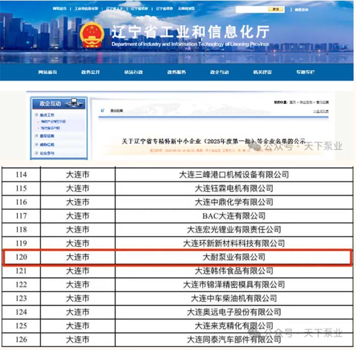近日,辽宁省经济和信息化厅正式公布2025年度第一批辽宁省"专精特新"中小企业认定名单,大耐泵业有限公司凭借在泵行业领域的专业化、精细化、特色化发展及持续创新能力,再次荣耀登榜!
