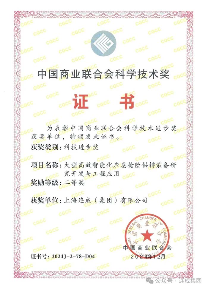 热烈祝贺上海连成(集团)有限公司所参与的大型高效智能化应急抢险供排装备研究开发与工程应用项目,荣获中国商业联合会科学进步奖。