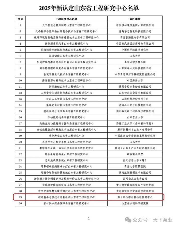 近日,山东省发展和改革委员会公布了2025年度省级工程研究中心名单,由烟台市标准计量检验检测中心牵头,烟台恒邦泵业、中核七院、哈工程大学、哈工程研究院5家科研单位共同筹建的“核电装备与核技术计量检测山东省工程研究中心”成功获批。标志着烟台市在核电装备与核技术计量检测领域迈上新台阶,将为山东省乃至全国核电产业的高质量发展提供强有力的技术支撑。