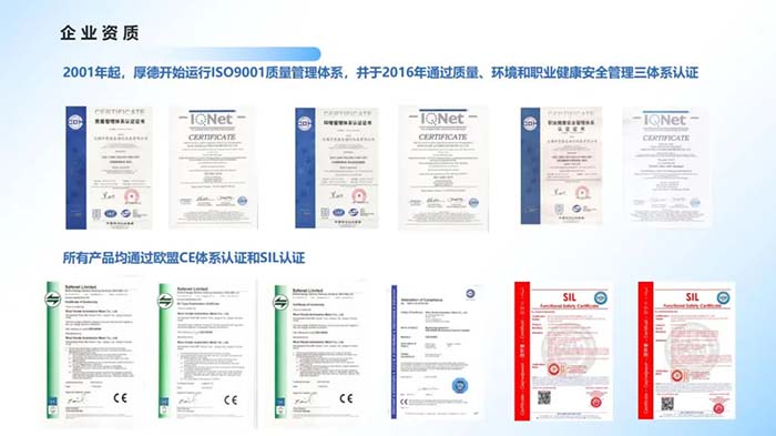 在后续的发展中,公司持续发力。多款产品通过国家防爆认证、矿用安标认证、国家 CCC 认证等。全系列产品均通过欧盟CE认证和SIL认证。