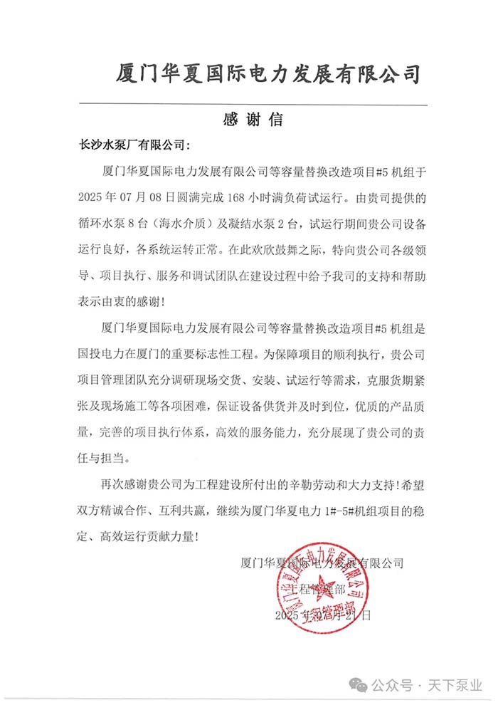 近日,长泵公司收到国能神华九江二期工程、厦门华夏国际电力发展有限公司的感谢信,信中高度赞扬了长泵公司在项目合作中所展现出的专业精神和技术实力。用户特别提到,长泵公司的团队在项目执行过程中,积极响应、高效沟通,不仅按时完成了设备安装与调试工作,克服困难保证了项目进度,还展现了售后服务的能力。团队的专业素养和技术水平令人印象深刻,每一个细节都处理得恰到好处,确保了设备的稳定运行和高效性能。这是对长泵公司“用诚信打造品牌 为客户创造价值”企业理念的生动诠释。长泵公司深知,客户的满意是企业发展的最大动力,每一封感谢信都是对团队辛勤付出的最好回报。未来,长泵公司将继续秉承这一理念,不断提升服务质量和技术水平,为更多客户提供优质的产品和服务,携手共创更加辉煌的明天。