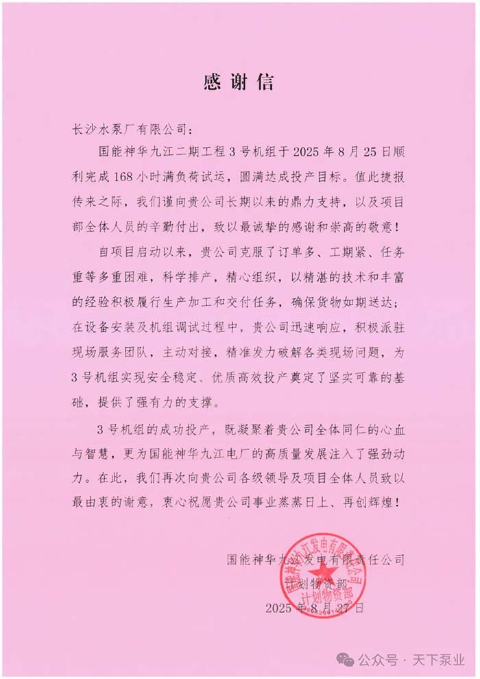 客户赞誉!长泵公司获国能神华九江、厦门华夏电力致谢