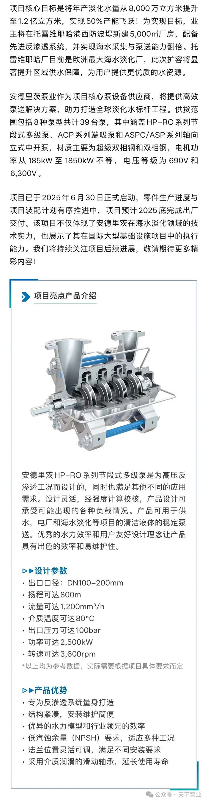 近日,业主ACUAMED(西班牙国家水资源公司)正式委托由Sacyr Agua(40%)、Sacyr Construcción(10%)、Cadagua(40%)及Ferrovial Construcción(10%)组成的联合体(UTE Torrevieja),承接西班牙阿利坎特托雷维耶哈(Torrevieja)海水淡化厂的扩建与四年运营维护的项目。