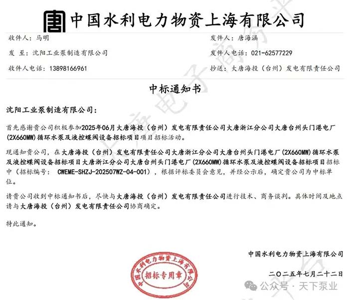 近日,中国大唐集团有限公司中国水利电力物质上海有限公司发布大唐台州头门港电厂(2×660MW)超超临界二次再热燃煤发电机组新建项目循环水泵设备中标结果公示,沈阳工业泵制造有限公司(简称沈工泵)中标该新建项目循环水泵设备4台套。这是沈工泵2025年斩获的第10份立式循环水泵合同,累计合同额突破8000余万元。