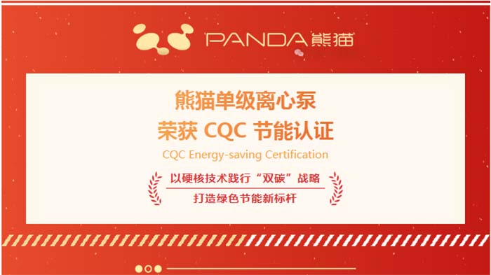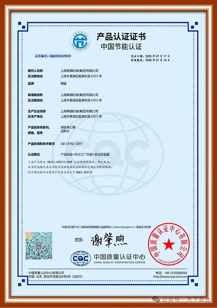 该证书由国家认可的权威机构 —— 中国质量认证中心(CQC)颁发,既是对熊猫单级离心泵节能性能的严格检验,更是对其技术的高度认可。此次认证通过,不仅直接证明该产品在机械设备领域的节能技术已达到行业领先水平,更充分体现我们熊猫集团紧跟国家 “双碳” 战略步伐,以技术创新推动绿色转型的坚定决心,为市政供水、工业循环、商业建筑等领域的节能改造提供了可靠选择。