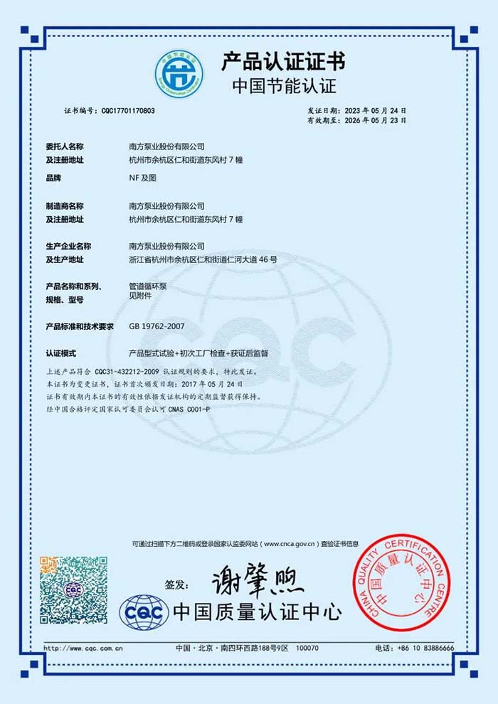 TD管道循环泵系列产品获得国家节能认证,该系列泵具有额定点高效率及高效区工作范围宽的特点,在额定流量点±20%的运行工况能保持较高的泵效率,符合节能、环保可持续发展的要求。