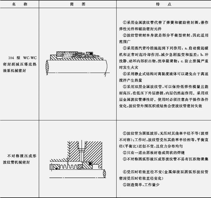 在石油化工和炼油装置中所应用的温度较高的热油泵有塔底热油泵、热载体泵、油浆泵、渣油泵、蜡油泵、沥青泵、熔融硫黄和增塑剂泵等,均采用机械密封。在高温油泵中采用硬对硬摩擦副解决低压含固体颗粒的减压塔底热油泵机械密封,采用焊接金属波纹管机械密封解决不同压力下的热油泵密封,采用轴封箱冷却套降低温度解决热油泵密封,采用翅片冷却轴封箱保护辅助密封解决热油泵密封以及采用双端面密封和加强冲洗等措施。见表 1。