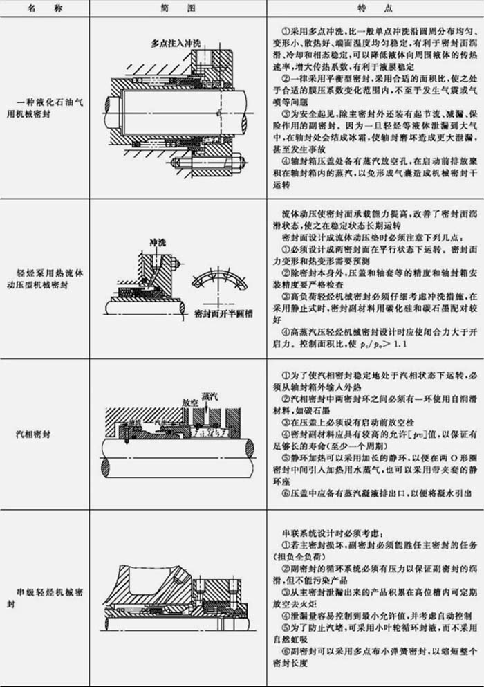 在石油化工及炼油厂中,有许多泵是在接近介质沸点(泡点)下工作,例如轻烃泵、液化气泵、液氨泵、热水泵等。因此,这些泵的机械密封有可能在液相、汽(气)相或汽液混相状态下工作。因为这些介质的常压沸点均低于一般泵的周围环境,所以必须注意勿使这类密封干运转或不稳定工作。为此,应在结构、辅助措施和工作条件控制方面采取有力的措施,例如加强冲洗保证轴封箱压力和温度,可使密封处于液相状态下工作或处于似液相状态下工作;采用流体动压密封可以使密封在良好的润滑状态下工作;采用加热方法可以使密封在稳定的汽相状态下工作。此外还可以采用串级式机械密封。见表 2。