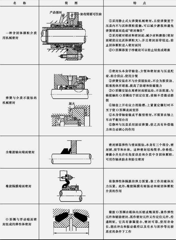 在炼油厂及石油化工厂中,含固体颗粒介质的泵采用机械密封。介质含固体颗粒及纤维对机械密封的工作十分不利。固体颗粒进入摩擦副,会使密封面发生剧烈磨损而导致失效。同样,纤维进入密封副也将引起密封严重的泄漏。因此,必须进行专门设计来解决含固体颗粒介质或溶解成分结晶或聚合等问题。解决这类问题要考虑结构(双端面,串级密封等)、冲洗及过滤,以及材料的选择等问题。见表 3。