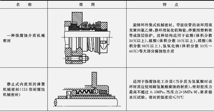 随着石油、石化生产的发展和机械密封的广泛使用,出现了化工腐蚀泵用机械密封,主要是酸泵和碱泵的机械密封。处于腐蚀性介质中工作的密封元件,不仅要注意每个零件本身的耐蚀性,还应防止组合在一起时产生的电偶腐蚀。强腐蚀条件下的密封主要依赖于材料,例如密封副材料用陶瓷、填充四氟乙烯等或浸渍四氟乙烯、碳石墨、氮化硅、耐蚀硬质合金等耐蚀材料,并且辅助密封采用耐蚀性良好的氟橡胶和聚四氟乙烯等材料。此外,从结构上可设法避免易受腐蚀的组件与腐蚀介质接触,如采用外装式波纹管结构、弹簧不与介质接触的内装式密封,危险性较大的介质用双端面密封和引入封液(阻塞流体)来保护密封装置。见表 4。