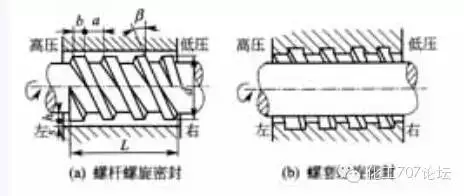 螺旋密封也是动力密封的一种形式,它是在旋转的轴上或者在轴的包容套上加工出螺旋槽,轴和套之间充有密封介质。轴的旋转使螺旋槽产生类似于泵的输送作用,从而阻止密封液的泄漏。其密封能力的大小与螺旋角度、螺距、齿宽、齿高、齿的作用长度以及轴与套之间的间隙大小有关。