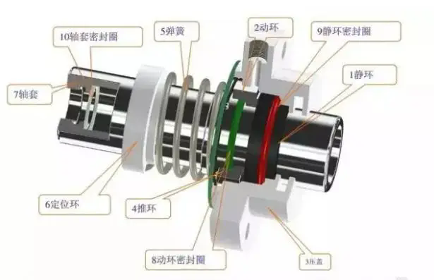 机械密封通常由动环、静环、压紧元件和密封元件组成。其中动环随泵轴一起旋转,动环和静环紧密贴合组成密封面,以防止介质泄漏。动环靠密封室中液体的压力使其端面压紧在静环端面上,并在两环端面上产生适当的比压和保持一层极薄的液体膜而达到密封的目的。压紧元件产生压力,可使泵在不运转状态下,也保持端面贴合,保证密封介质不外漏,并防止杂质进入密封端面。