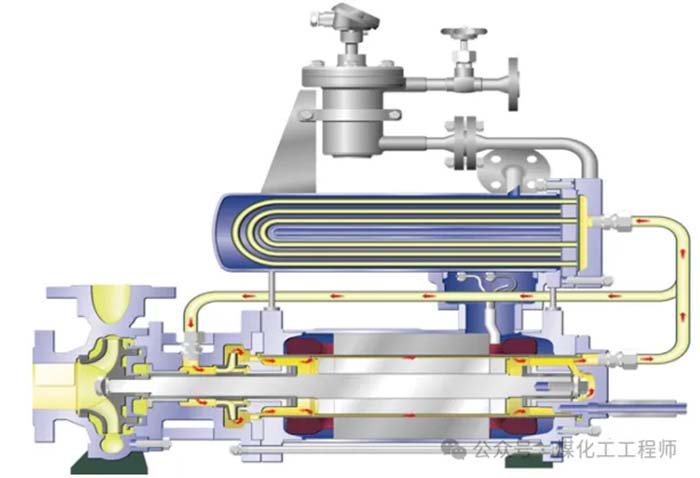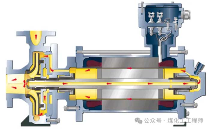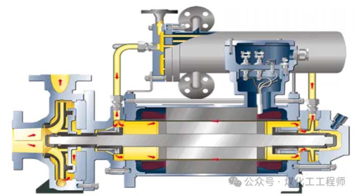 单级泵:部分流体从出口流经电机,经辅助叶轮二次加压后流回出口,使得电机腔内的压力与出口压力保持一致。